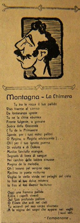 La prima versione de La Chimera uscì nel 1912 su «Il Papiro» con il titolo di Montagna-La Chimera.